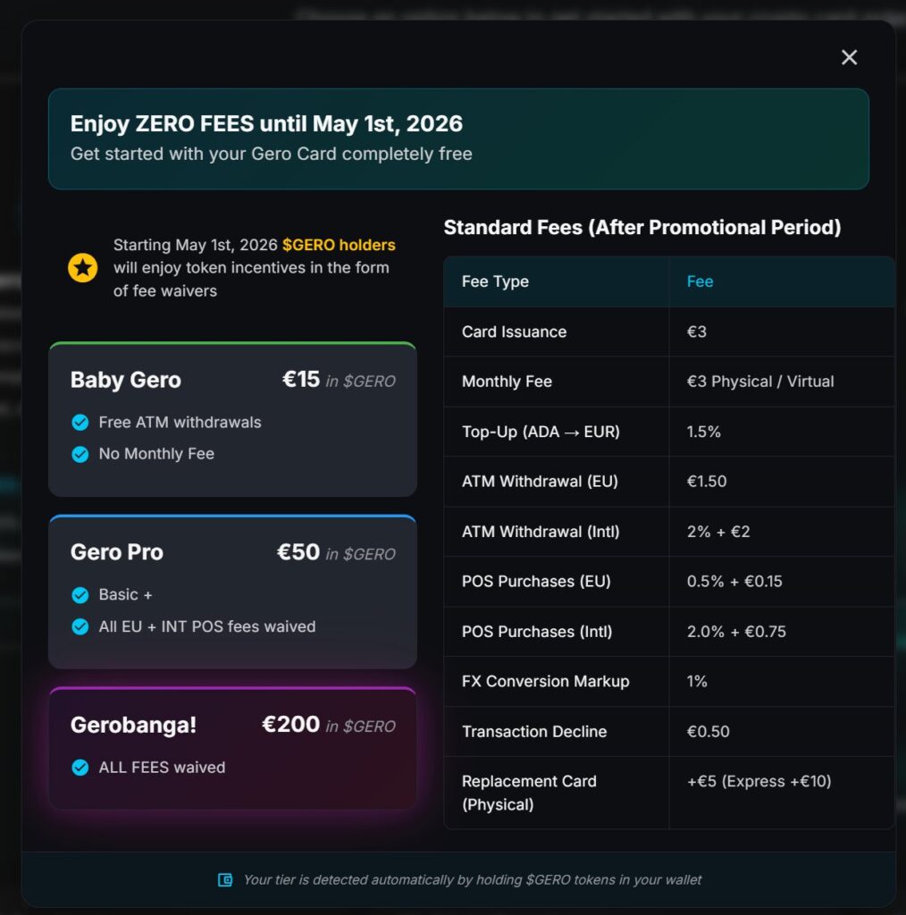 Bottom line: hold €200 worth of $GERO and enjoy a lifetime of zero fees — while using ADA like a true degen grown-up. 🧠💳
